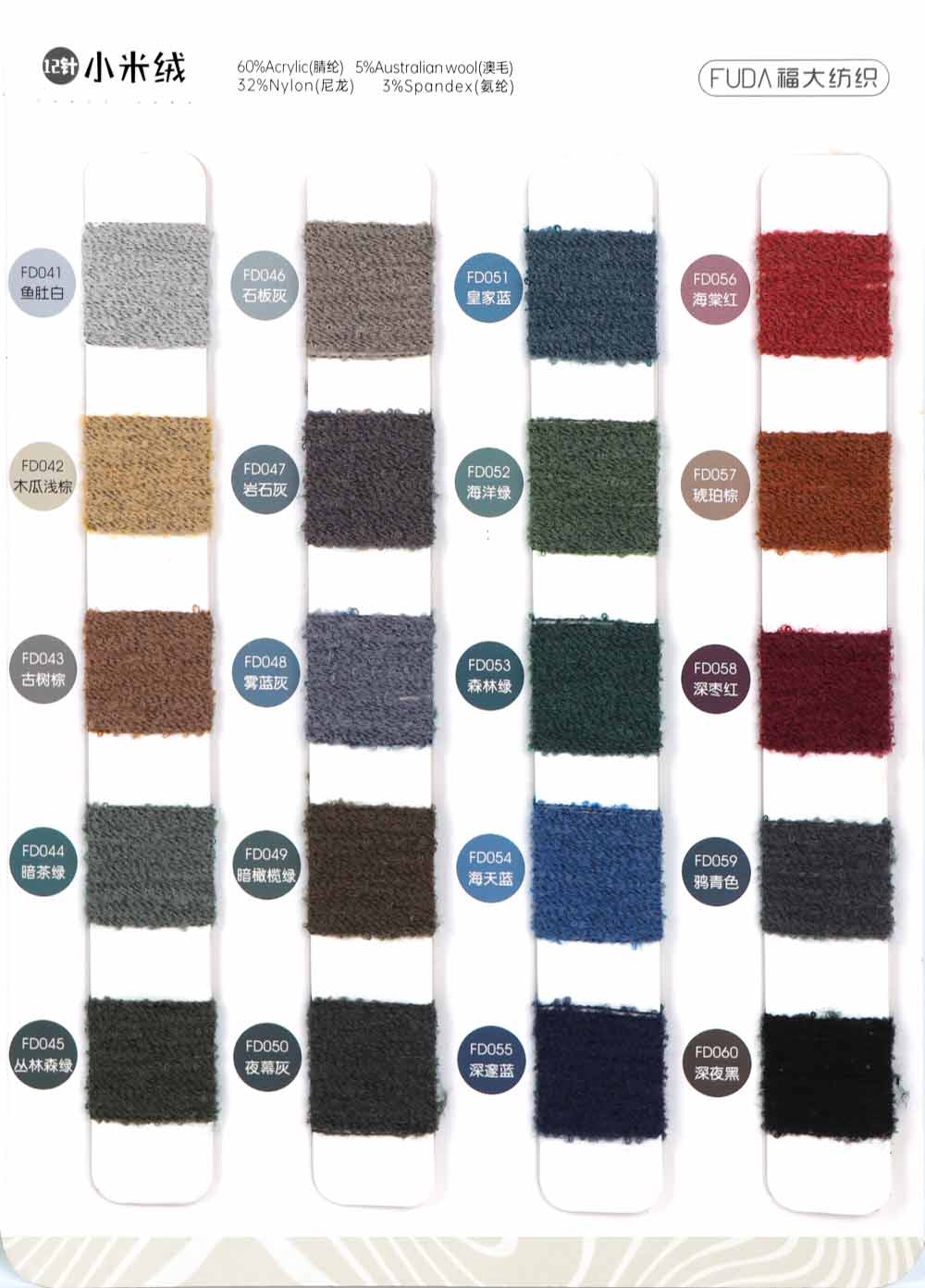 60%腈纶Acrylic 5%澳毛Australian wool 32%尼龙Nylon 3%氨纶Spandex