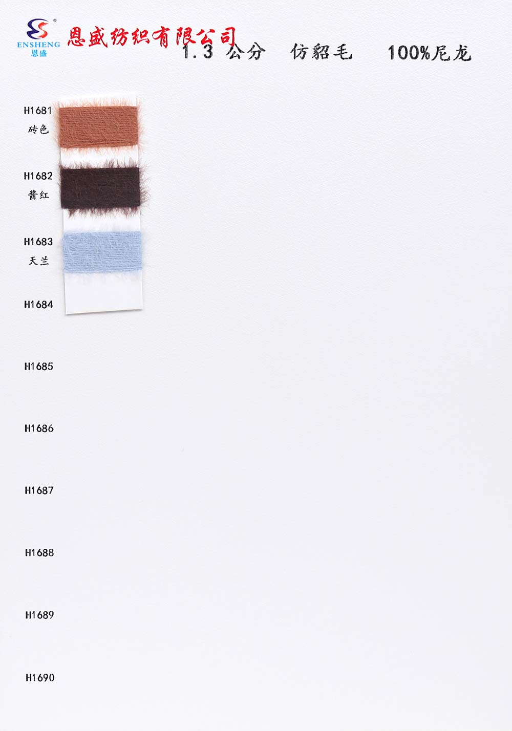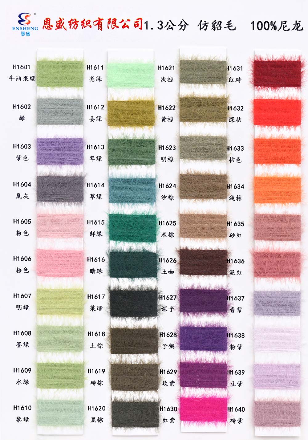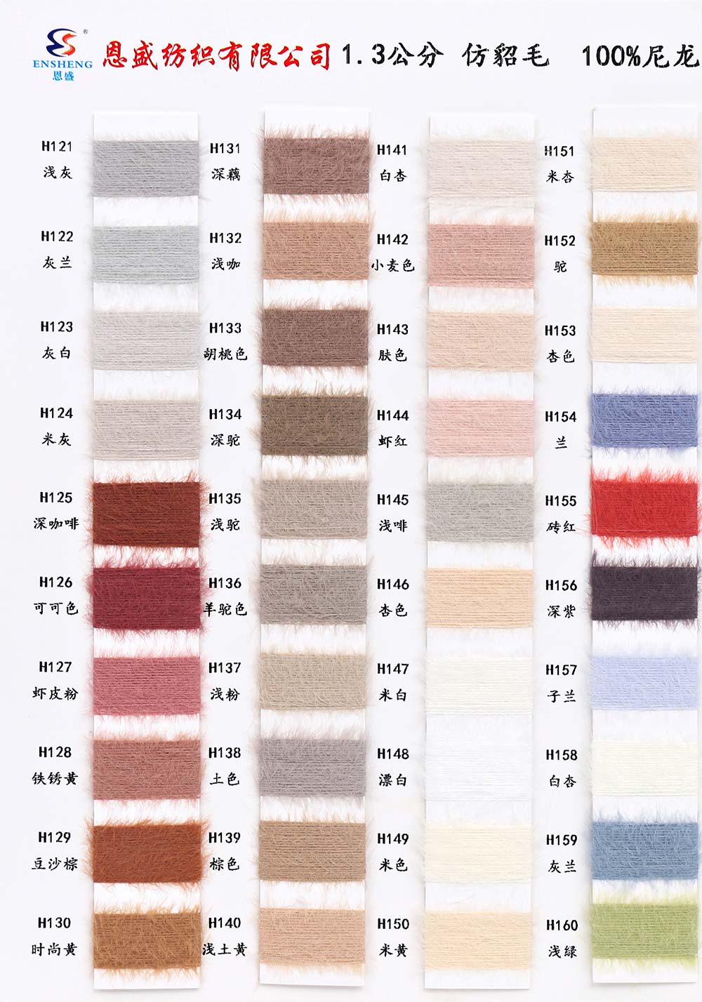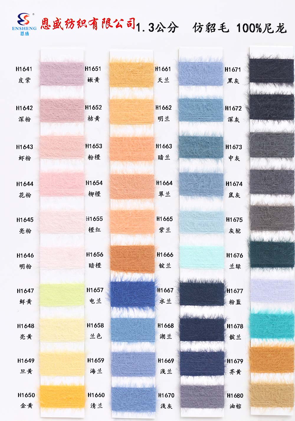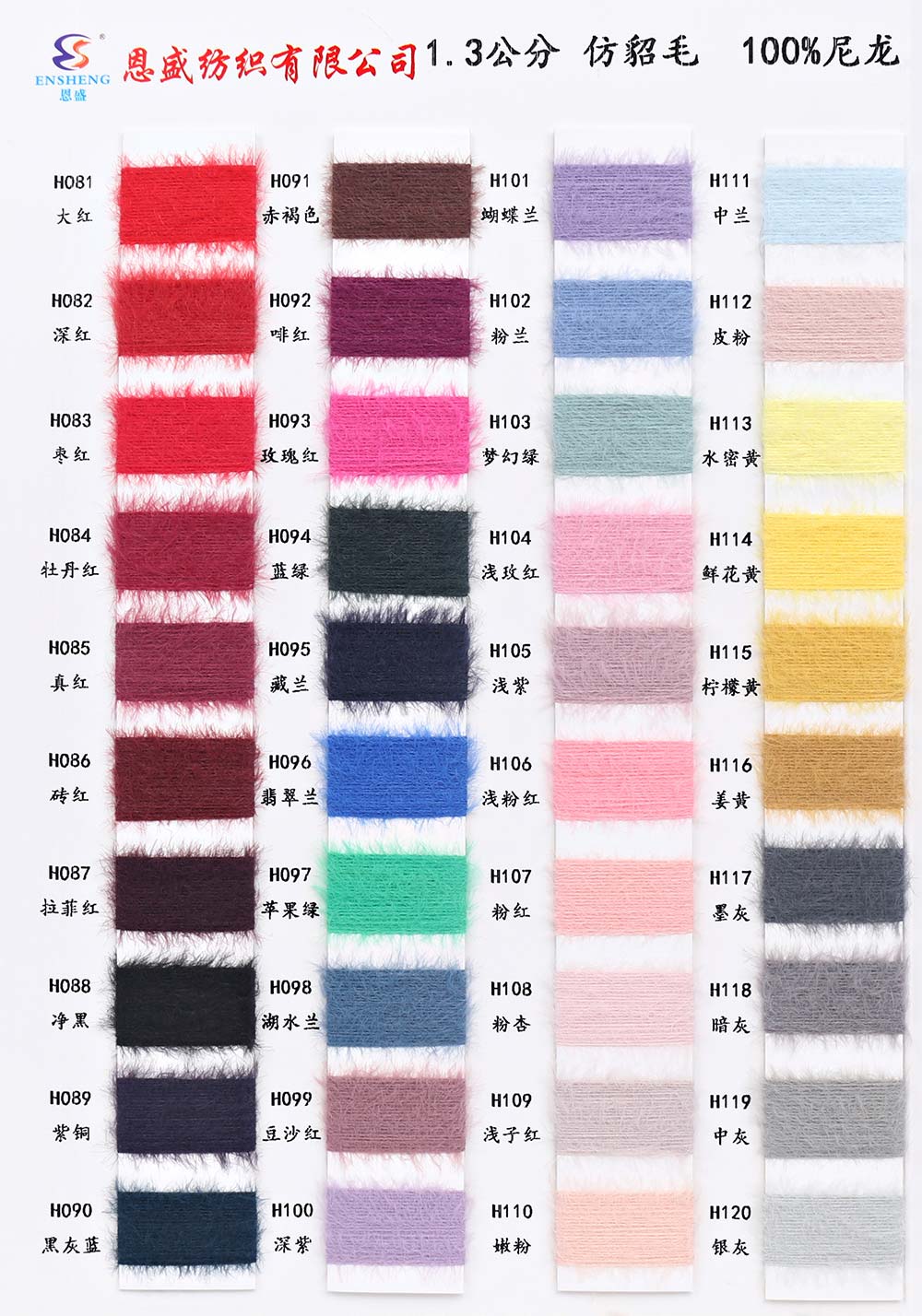 有色丝光棉,有色冰爽丝,有色仿亚麻,有色双曲,有色天丝,有色兔绒/高弹包芯纱,有色莫代尔包芯纱,有色安哥拉北极绒,有色羊毛纤弹绒,银丝亲肤绒,有色安迪绒,有色仿棉,半精梳棉纱,有色羊毛混纺,有色鹿毛绒,1.3公分不掉毛仿貂
