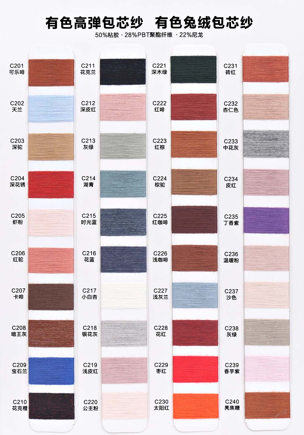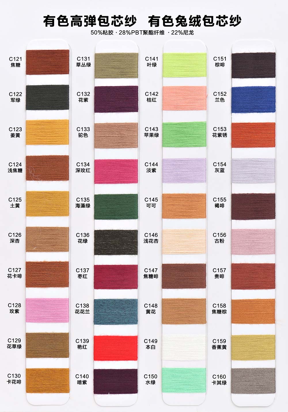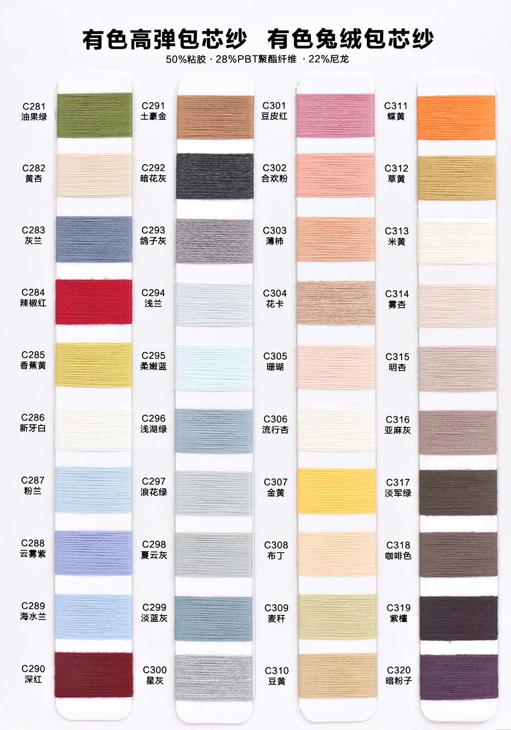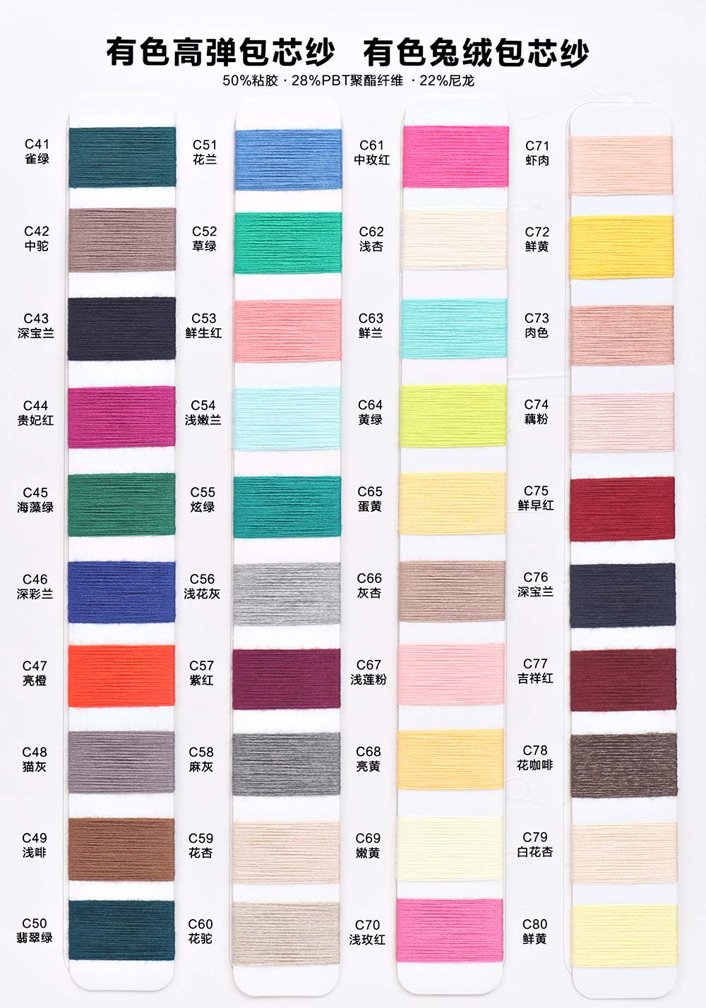 有色丝光棉,有色冰爽丝,有色仿亚麻,有色双曲,有色天丝,有色兔绒/高弹包芯纱,有色莫代尔包芯纱,有色安哥拉北极绒,有色羊毛纤弹绒,银丝亲肤绒,有色安迪绒,有色仿棉,半精梳棉纱,有色羊毛混纺,有色鹿毛绒,1.3公分不掉毛仿貂