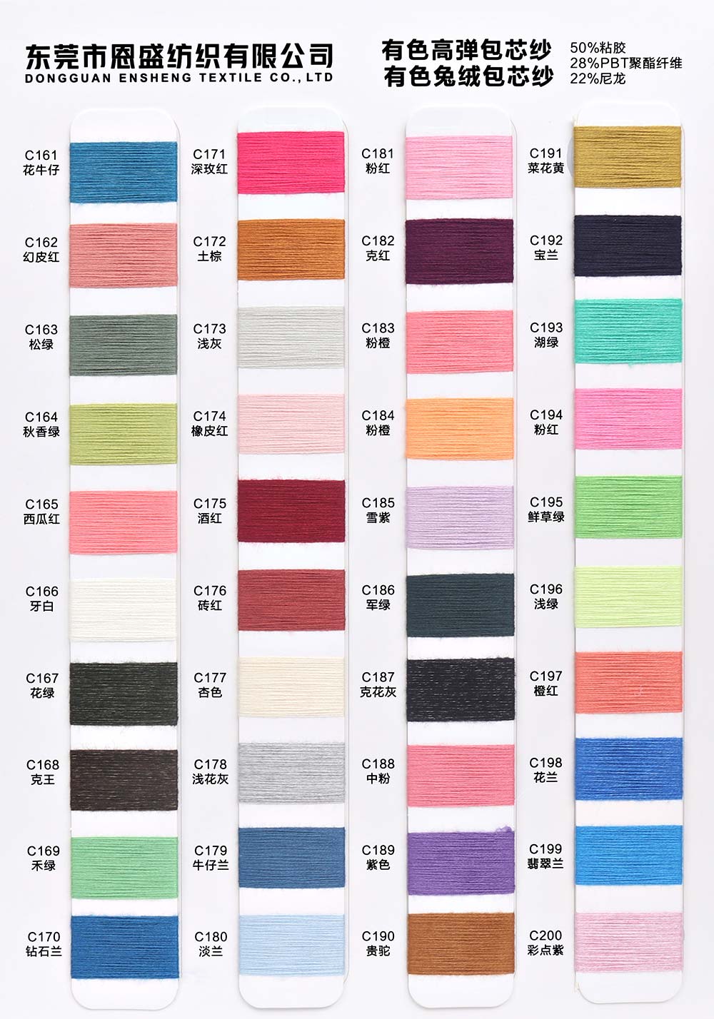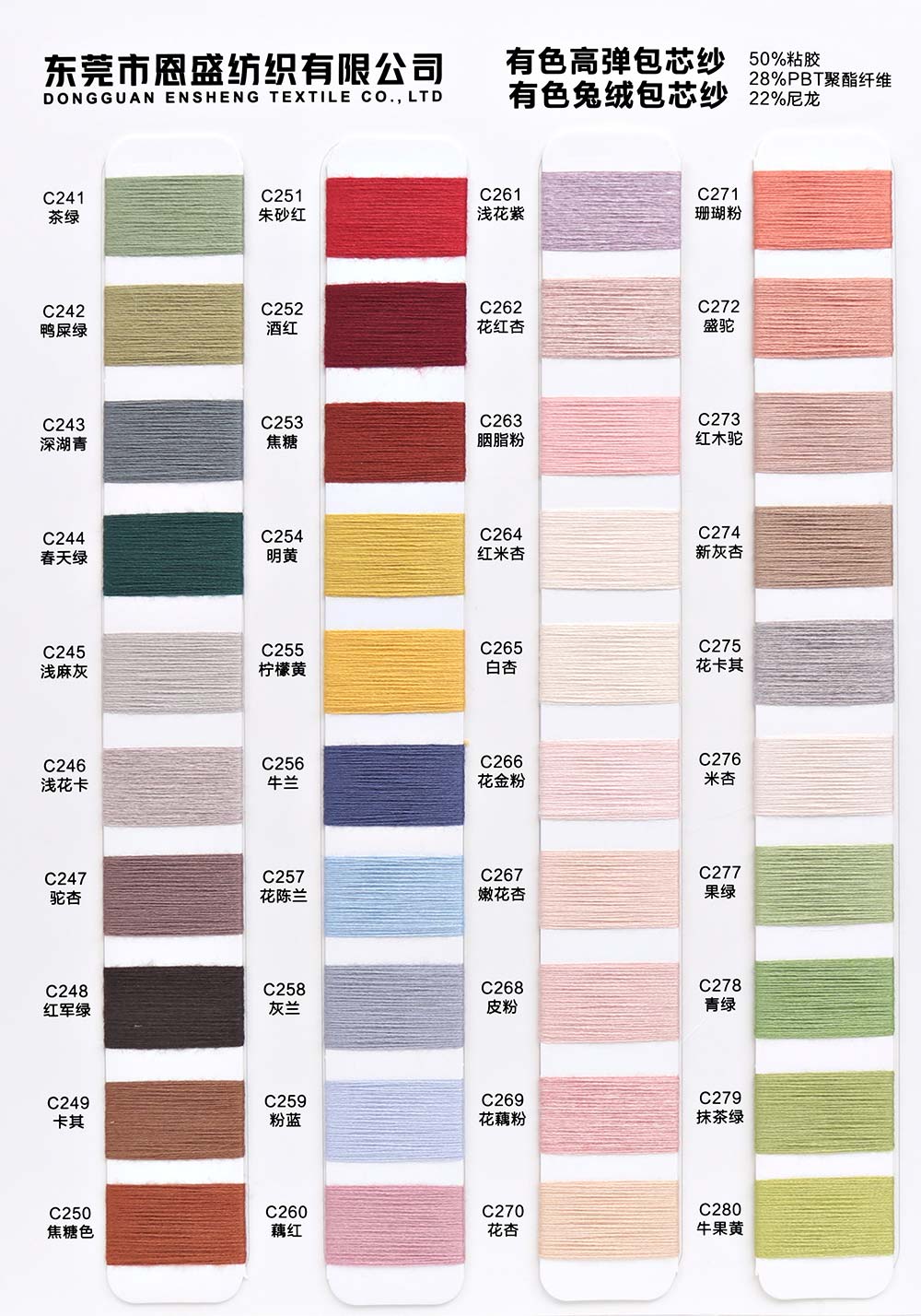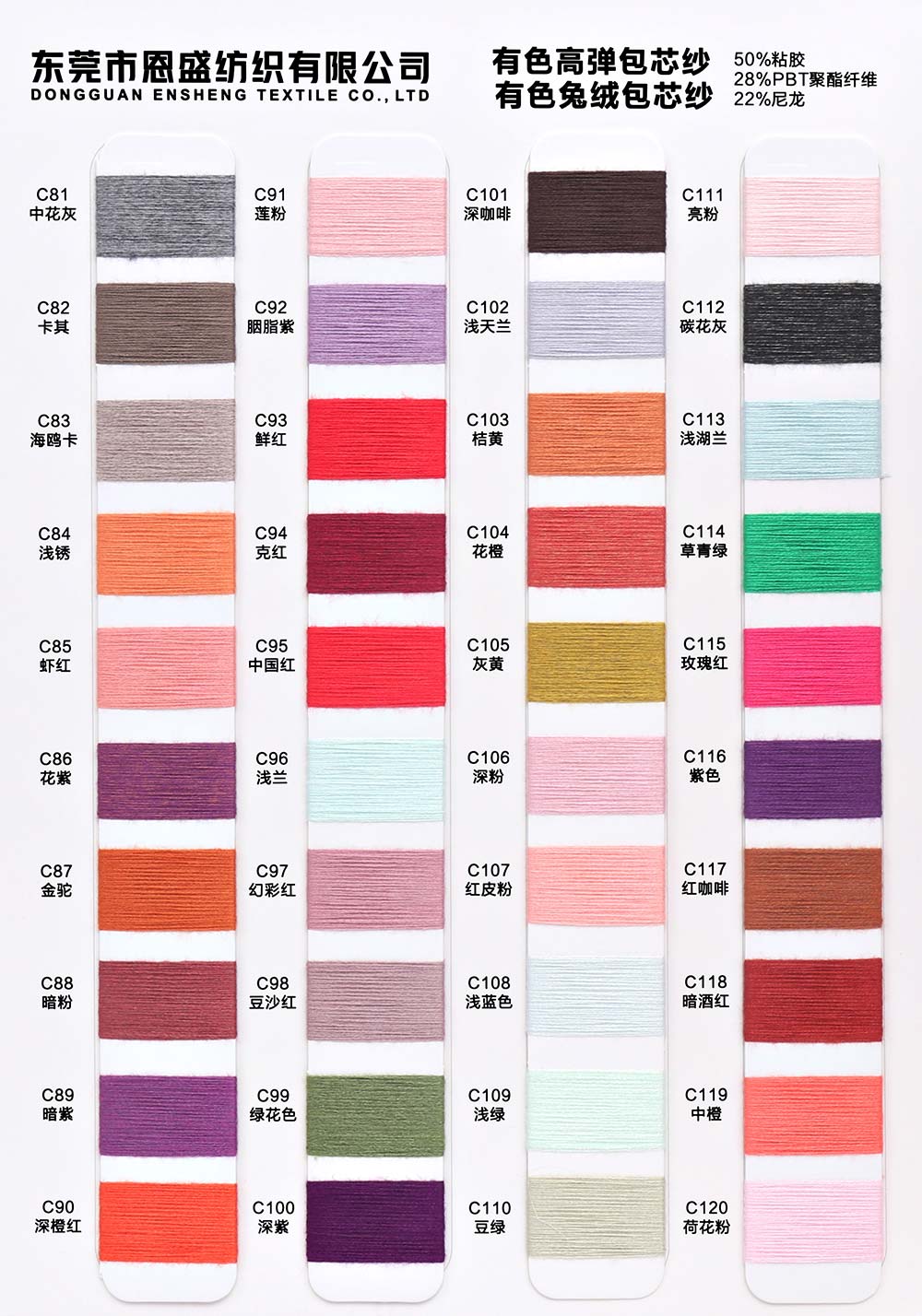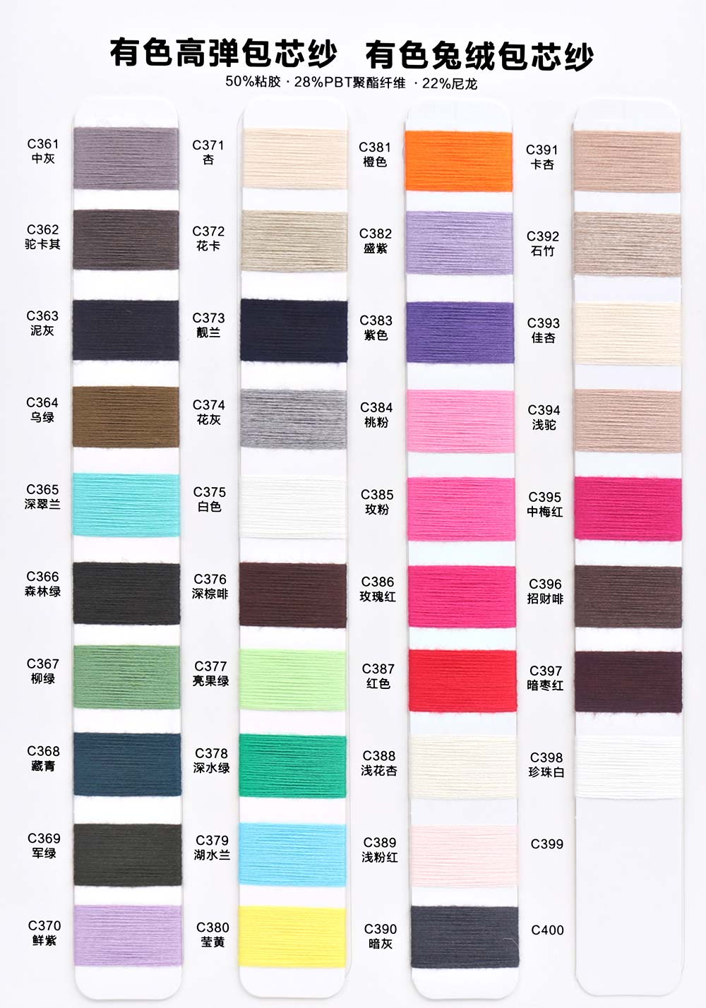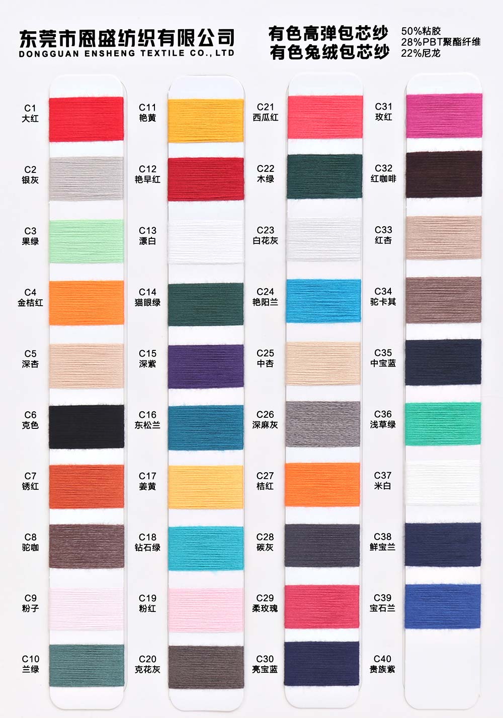 有色丝光棉,有色冰爽丝,有色仿亚麻,有色双曲,有色天丝,有色兔绒/高弹包芯纱,有色莫代尔包芯纱,有色安哥拉北极绒,有色羊毛纤弹绒,银丝亲肤绒,有色安迪绒,有色仿棉,半精梳棉纱,有色羊毛混纺,有色鹿毛绒,1.3公分不掉毛仿貂